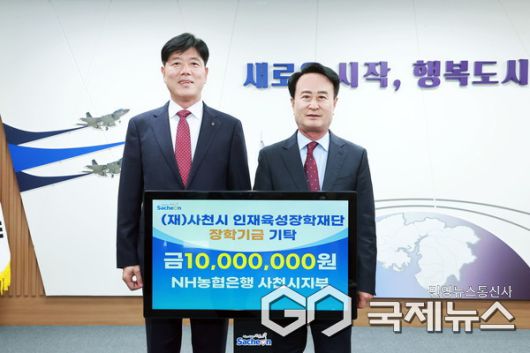 (사천=국제뉴스) 구정욱 기자 = NH농협은행 사천시지부는 지난 19일 사천시청을 방문해 지역 인재 육성을 위한 장학금 1000만 원을 사천시 인재육성장학재단에 전달했다.