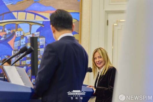 [서울=뉴스핌] 조르자 멜로니 이탈리아 총리가 지난 19일 청와대에서 이재명 대통령과 정상회담을 마치고 공동 언론발표를 하고 있다. [사진=청와대] 2026.01.20 photo@newspim.com