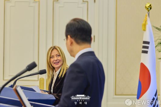 [서울=뉴스핌] 조르자 멜로니 이탈리아 총리가 지난 19일 청와대에서 이재명 대통령과 정상회담을 마치고 공동 언론발표를 하고 있다. [사진=청와대] 2026.01.20 photo@newspim.com