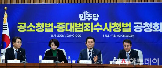 아시아투데이 이병화 기자 = 정청래 더불어민주당 대표가 20일 국회에서 열린 공소청법-중대범죄수사청법 공청회에서 발언을 하고 있다.