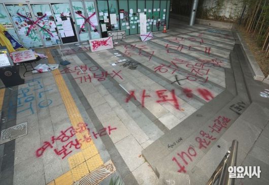 지난 2024년 11월19일, 남녀공학 전환을 반대한다는 내용의 래커칠로 얼룩져 있는 동덕여대 교내 ⓒ<일요시사> DB |