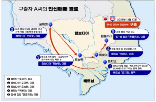 A씨는 범죄조직에 저항했으나, "불법 월경했다는 사실이 알려지면 현지 경찰에 체포된다"는 협박을 듣고 감금 생활을 이어가다 캄보디아 포이펫, 프놈펜, 베트남 목바이를 거쳐 최종적으로 베트남 국경 인근 캄보디아 몬돌끼리주 스캠 조직으로 팔아넘겨졌다.