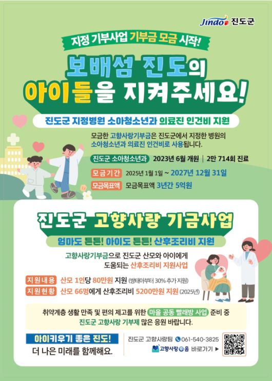 또한, 지난해부터 지정 기부 사업으로 모금하고 있는 '보배 섬 진도의 아이들을 지켜주세요'(진도군 지정병원 소아청소년과 의료진 인건비 지원)의 목표 달성을 위해 적극적인 홍보와 참여 확대에 나서고, 올해부터 고향사랑기부제 기부자에 대한 예우 강화를 통해 기부자와 진도군 간의 유대감을 높이고, 인구 감소 지역 대응에도 적극 나설 방침입니다.