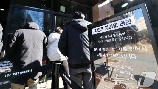 (서울=뉴스1) 최지환 기자 = '두바이 쫀득 쿠키(두쫀쿠)' 열풍이 계속되는 20일 오후 서울 종로구 한 제과점에서 시민들이 두쫀쿠를 구매하기 위해 줄을 서 있다. 2026.1.20/뉴스1