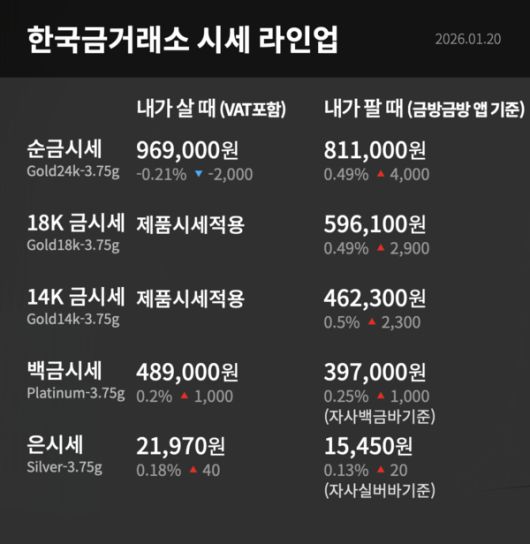 (더쎈뉴스 / The CEN News 이한민 ) 2026년 1월 20일 한국금거래소에 따르면 순금(24K·3.75g)의 구매 가격은 전날보다 0.21%(2,000원) 내린 96만9,000원으로 집계됐다. 반면 판매 가격은 0.49%(4,000원) 오른 81만1,000원을 기록했다.