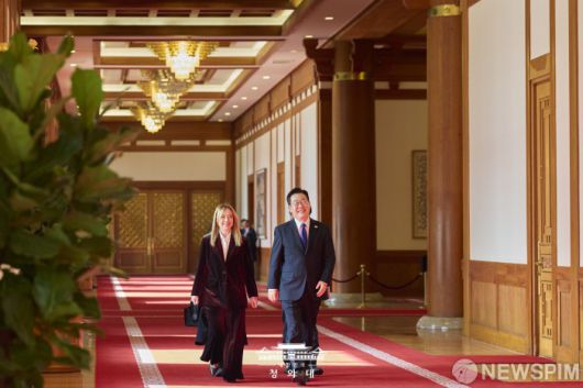 [서울=뉴스핌] 이재명 대통령이 지난 19일 청와대에서 조르자 멜로니 이탈리아 총리와 오찬을 위해 이동하고 있다. [사진=청와대] 2026.01.20 photo@newspim.com