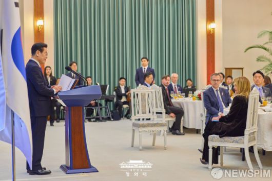 [서울=뉴스핌] 이재명 대통령이 지난 19일 청와대에서 열린 조르자 멜로니 이탈리아 총리 환영 공식 오찬에서 환영사를 하고 있다. [사진=청와대] 2026.01.20 photo@newspim.com