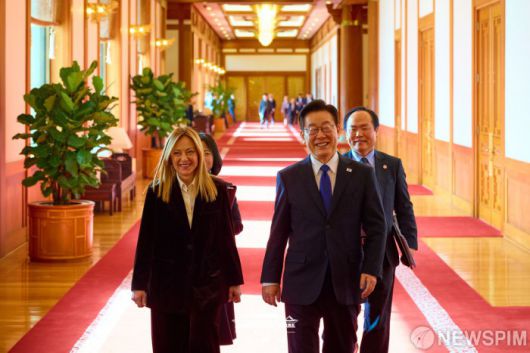 [서울=뉴스핌] 이재명 대통령이 지난 19일 청와대에서 조르자 멜로니 이탈리아 총리와 오찬을 위해 이동하고 있다. [사진=청와대] 2026.01.20 photo@newspim.com