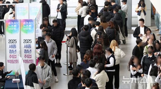 [세종=뉴시스] 강종민 기자 = 청년취업박람회에서 행사장 입장을 위해 구직자들이 줄지어 서 있다. 2025.11.06. ppkjm@newsis.com |