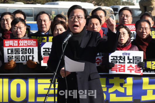 송언석 국민의힘 원내대표는 20일 서울 종로구 청와대 앞 분수대에서 규탄대회를 열고 “이재명 정부는 통일교 게이트와 공천 뇌물과 같은 정치권의 뿌리 깊은 검은 돈을 뿌리 뽑자는 특검 요구를 왜 외면하고 있나“라며 이같이 비판했다. 송 원내대표는 “통일교 특검은 김병기 전임 원내대표 시절 상당 부분 의견 교환이 있었으나, 갑자기 이재명 대통령이 검경 합동수사본부에 수사 지시를 하면서 일이 뒤틀리기 시작했다”고 꼬집었다.