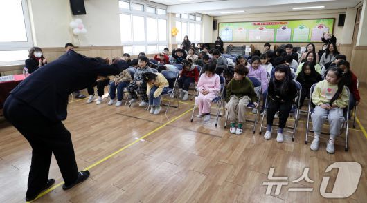 (부산=뉴스1) 윤일지 기자 = 20일 부산 사상구 괘법초등학교 동백관에서 열린 감전초와의 통합 전 이별식에서 교장 선생님이 손으로 하트를 만들며 재학생들에게 작별 인사를 하고 있다. 1982년 전교생 1261명의 대규모 학교로 개교했던 괘법초는 저출생으로 인한 학생 수 감소로 폐교가 결정돼 오는 3월 감전초에 통합된다. 괘법초를 비롯해 올해 부산에서 사라지는 초등학교는 영도구 봉삼초와 신선초 등 3곳이다. 2026.1.20/뉴스1