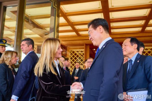 [서울=뉴스핌] 이재명 대통령이 지난 19일 청와대에서 조르자 멜로니 이탈리아 총리와 악수를 하고 있다. [사진=청와대] 2026.01.20 photo@newspim.com
