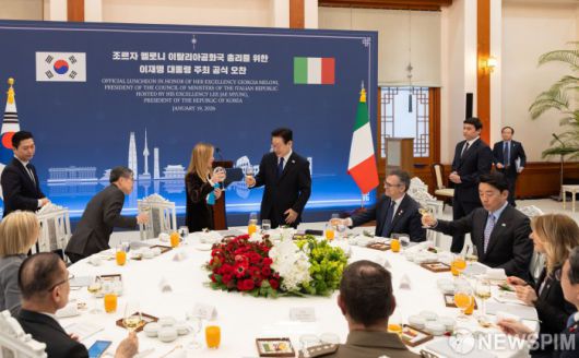 [서울=뉴스핌] 이재명 대통령이 지난 19일 청와대에서 조르자 멜로니 이탈리아 총리와 건배를 하고 있다. [사진=청와대] 2026.01.20 photo@newspim.com