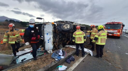 제주 평화로에서 화물차가 전도돼 70대 운전자가 숨졌다.