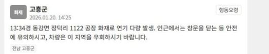 [사진=안전재난문자] 전라남도 고흥군 동강면의 한 공장에서 화재가 발생했다.20일 고흥군은 안전재난문자를 통해 "이날 오후 1시 34분경 동강면 장덕리 1122 공장 화재로 연기 다량 발생했다"며 "인근에서는 창문을 닫는 등 안전에 유의하시고, 차량은 이 지역을 우회하시기 바란다"고 밝혔다. 아주경제=정세희 기자 ssss308@ajunews.com - Copyright ⓒ [아주경제 ajunews.com] 무단전재 배포금지 -