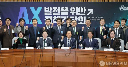 [서울=뉴스핌] 윤창빈 기자 = 정청래 더불어민주당 대표, 김정관 산업통상부 장관 등 참석자들이 20일 서울 여의도 국회에서 열린 AX 발전을 위한 정책간담회에서 기념촬영을 하고 있다. 2026.01.20 pangbin@newspim.com