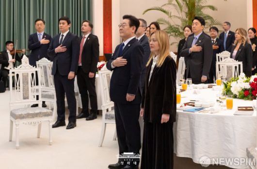 [서울=뉴스핌] 이재명 대통령이 지난 19일 청와대에서 열린 조르자 멜로니 이탈리아 총리 환영 공식 오찬에서 국기에 대한 경례를 하고 있다. [사진=청와대] 2026.01.20 photo@newspim.com