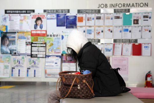 서울 시내의 한 대학교 일자리플러스센터에 학생이 채용정보 게시판 앞에 앉아 있다. |