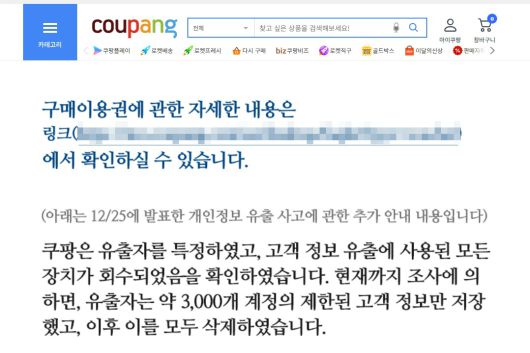 앞서 쿠팡은 지난달 25일 셀프 조사 발표에 나서면서 '개인정보 유출 규모가 3370만 건이 3000여 건에 불과하며 모두 삭제됐다'는 내용의 '유출 사고 추가 안내글'글을 게재해오고 있다.