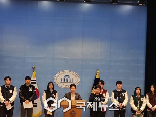 ▲정을호 의원과 전국 사립대 총학생회 대표들은 20일 국회 소통관에서 열린 기자회견에서대학 등록금 인상 문제의 심각성을 국민 앞에 호소했다. 학생들은 “등록금 1천만 원 시대가 현실화되면 청년들에게 4년간 4천만 원의 빚을 지우는 것”이라며 반발 사진=고정화 기자 |