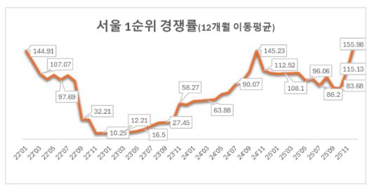 분양평가 전문회사 리얼하우스가 20일 한국부동산원 청약홈 자료를 분석한 결과, 지난해 12월 서울 아파트 1순위 평균 청약 경쟁률은 최근 12개월 이동평균 기준 155.98대 1로 나타났다. 이는 2022년 1월(144.91대 1) 이후 최고치로, 최근 3년 중 가장 높은 수준이다.