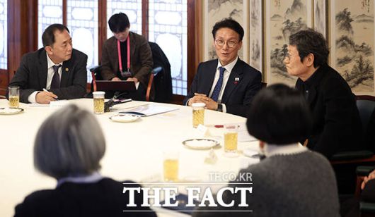 [더팩트ㅣ임영무 기자] 김민석 국무총리(오른쪽 두 번째)가 20일 오후 서울 종로구 삼청동 총리공관에서 손정우 한국연극협회 이사장, 배우 문성근 및 연극인들과 간담회를 갖고 있다.