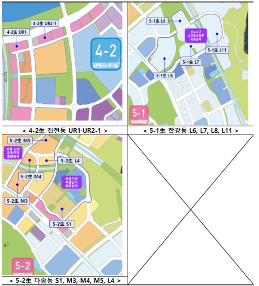 먼저 합강동 '선도지구 스마트리빙존 특화권역'은 스마트 라이프와 직주근접 커뮤니티 실현을 위한 첨단 스마트도시 서비스가 도입된다. 이어 다솜동 용호천 인근 '보행 친화 공동주택 특화권역'은 소규모 블록 계획을 통한 보행 친화형 주거단지로, 중앙부 '공공시설 복합단지 특화권역' 주거단지는 문화공원을 중심으로 공공청사, 학교 등과 연계해 통합적으로 조성되는 것이 특징이다.