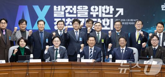 (서울=뉴스1) 이승배 기자 = 정청래 더불어민주당 대표가 20일 서울 여의도 국회에서 열린 AX 발전을 위한 정책간담회에서 김정관 산업통상자원부 장관을 비롯한 주요 참석자들과 기념촬영하고 있다. 2026.1.20/뉴스1photolee@news1.krCopyright ⓒ 뉴스1. All rights reserved. 무단 전재 및 재배포, AI학습 이용 금지.