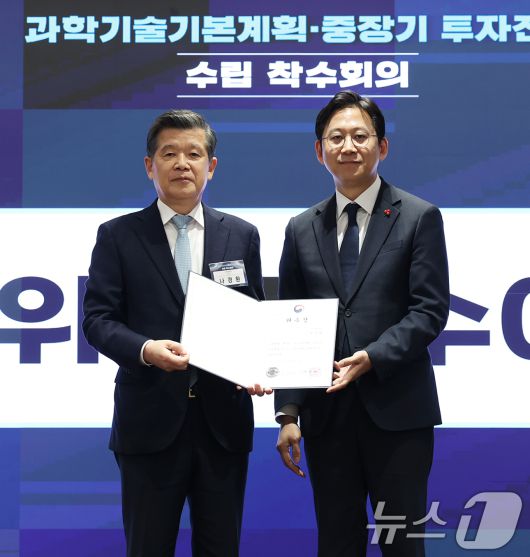 (서울=뉴스1) 오대일 기자 = 배경훈 부총리 겸 과학기술정보통신부 장관이 20일 오후 서울 중구 코리아나 호텔에서 열린 제6차 과학기술기본계획 및 제2차 중장기 투자전략 수립 착수회의에서 나경환 국가연구개발 중장기 투자전략 수립 총괄위원장에게 위촉장을 수여한 후 기념촬영을 하고 있다. 2026.1.20/뉴스1