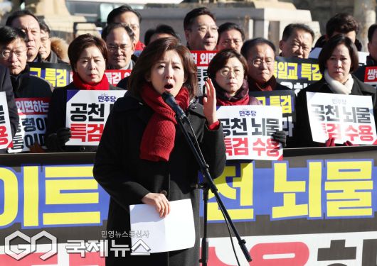 (서울=국제뉴스) 나경원 국민의힘 의원이 20일 오전 서울 중로구 청와대 분수대 앞에서 열린 통일교 게이트 및 더불어민주당 공천뇌물 특검 촉구 규탄대회에서 규탄사를 하고 있다./사진=이용우 기자
