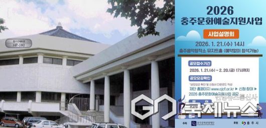 (충주=국제뉴스) 김상민 기자 = (재)충주문화관광재단(이하 재단)은 충북 충주시 예술인 및 예술단체 창작활동 기반을 마련해 문화예술 생태계를 조성하기 위해 19일부터'2026 충주문화예술지원사업'공모를 진행한다고 밝혔다.