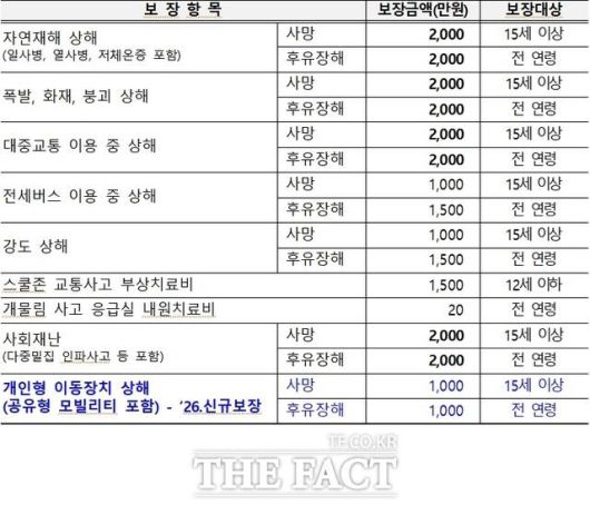 지난해 14개에서 16개로 확대한 올해 보장항목의 주요 내용은 △자연재해 사망·후유장해(일사병·열사병·저체온증 포함) △폭발·화재·붕괴 사망·후유장해 △대중교통 이용 중 상해 사망·후유장해 △강도 상해 사망·후유장해 △스쿨존 교통사고 부상 치료비 △전세버스 이용 중 상해 사망·후유장해 △개물림사고 응급실 내원 치료비 △사회재난 사망·후유장해 △개인형 이동장치(공유형 모빌리티 포함) 사고 사망·후유장해 등이다. 최대 2000만 원까지 보장된다.
