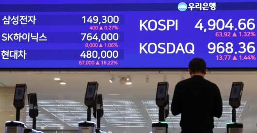 19일 서울 중구 우리은행 본점 로비에 코스피 종가가 표시돼있다./연합뉴스 |