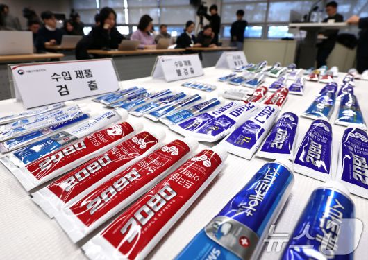 20일 오후 양천구 서울지방식약청 브리핑실에 트리클로산이 검출된 애경 2080치약이 진열돼 있다. 식품의약품안전처는 최근 국내에서 사용 금지된 물질인 '트리클로산'이 함유된 '2080 수입 치약' 전 제품에 대한 검사 결과, 중국 제조소인 Domy(도미)에서 생산한 일부 치약에서 해당 성분이 최대 0.16% 검출됐지만 인체에 무해한 수준이라고 밝혔다. 국내에서 제조된 치약 128종에서는 트리클로산이 모두 검출되지 않은 것으로 나타났다. 2026.1.20/뉴스1 ⓒ News1 구윤성 기자 |