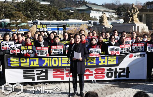 (서울=국제뉴스) 송언석 국민의힘 원내대표가 20일 오전 서울 중로구 청와대 분수대 앞에서 열린 통일교 게이트 및 더불어민주당 공천뇌물 특검 촉구 규탄대회에서 규탄사를 하고 있다./사진=이용우 기자