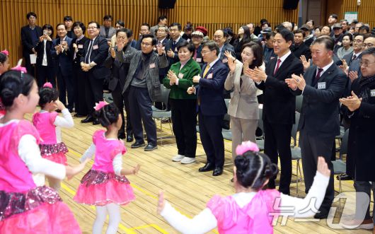 (서울=뉴스1) 김명섭 기자 = 20일 서울 중구 시청 다목적홀에서 열린 2026년 대한노인회 서울시연합회 신년인사회에서 고광선 서울시연합회장, 오세훈 서울시장, 최호정 서울시의회 의장, 정근식 서울시교중감 등 참석자들이 아이들 공연을 보고 손뼉을 치고 있다. 2026.1.20/뉴스1