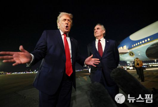 19일(현지시간) 밤 도널드 트럼프 미국 대통령(좌)이 미국 플로리다주 팜비치 국제공항에서 워싱턴으로 떠나기 전 기자들에게 발언하고 있다. [사진=로이터 뉴스핌] |