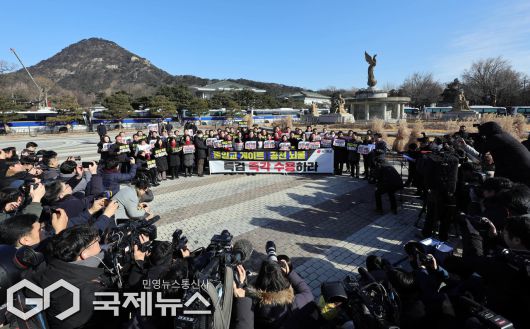 (서울=국제뉴스) 국민의힘 송언석 원내대표와 의원들이 20일 오전 서울 중로구 청와대 분수대 앞에서 열린 통일교 게이트 및 더불어민주당 공천뇌물 특검 촉구 규탄대회에서 피켓을 들고 구호를 외치고 있다./사진=이용우 기자