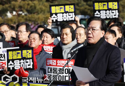 靑 앞에 선 국힘 의원들 '쌍특검 수용 촉구'