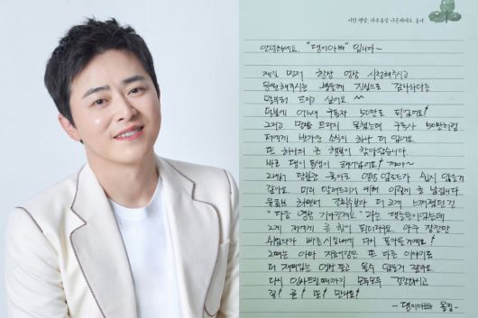 지난 18일 조정석은 유튜브 채널 ‘청계산댕이레코즈’에 자필 손편지를 게재했다. 조정석은 해당 채널에서 부캐릭터인 ‘댕이아빠 조점석’으로 활약하고 있다.