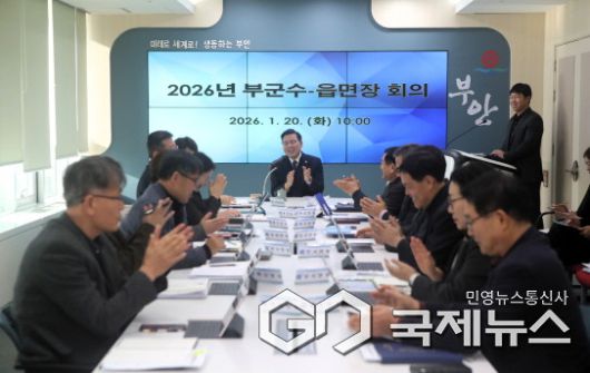 (부안=국제뉴스) 조판철 기자 = 부안군은 20일 군청 3층 중회의실에서 정화영 부군수 주재로 2026년 부군수-읍·면장 회의를 개최하고 2025년 주요 성과와 2026년 군정 운영방향을 공유하며 읍·면 현안에 대한 사전 점검에 나섰다고 밝혔다.
