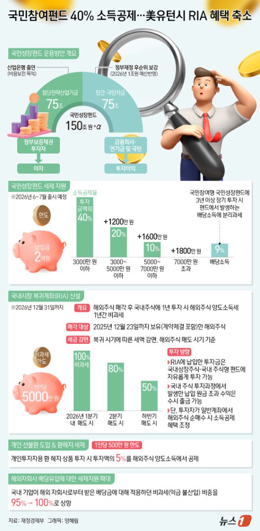 (서울=뉴스1) 양혜림 디자이너 = 정부가 2월 임시국회에서 '국민참여형 국민성장펀드'와 '국내시장 복귀계좌'(RIA) 도입을 위한 세법 개정을 추진한다. 개정안에서 국민성장펀드는 투자 금액에 따라 최대 40%의 파격적인 소득공제 혜택을 부여하고, RIA는 해외주식 재투자를 막는 '체리피킹' 방지 장치를 구체화했다.
