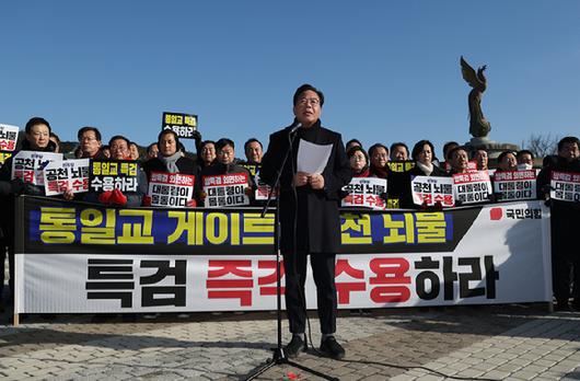 송언석 원내대표는 이날 서울 종로구 청와대 사랑채 분수대 앞에서 열린 '통일교 게이트·더불어민주당 공천뇌물 특검 촉구 규탄대회'에서 "이재명 정부는 통일교 게이트와 공천 뇌물, 정치권의 뿌리 깊은 검은돈을 뿌리 뽑자는 특검 요구를 왜 외면하고 있느냐"며 "이 대통령과 민주당은 쌍특검을 즉각 수용해야 한다"고 촉구했다.