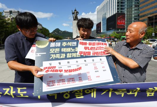 택배노동자과로사대책위원회 회원들이 서울 종로구 광화문광장에서 쿠팡 택배노동자 추석 명절 휴식권 보장 촉구 시민사회단체 공동 기자회견을 열고 휴식권 보장을 요구하는 상징의식을 하고 있다. |