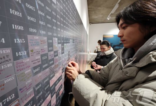 (서울=뉴스1) 김진환 기자 = 20일 오후 서울 중구 프리즈 하우스 서울에서 열린 BTS 뷔의 포토북 ‘타입 비(TYPE 非)’ 발간 기념 오프라인 전시 ‘뷔 타입 비 : 온-사이트 인 서울(V TYPE 非 : ON-SITE IN SEOUL)’을 찾은 관람객이 응원 문구를 남기고 있다. 한편 뷔가 속한 BTS는 3월 20일 다섯 번째 정규 앨범 ‘아리랑(ARIRANG)’을 발매한다. 2026.1.20/뉴스1