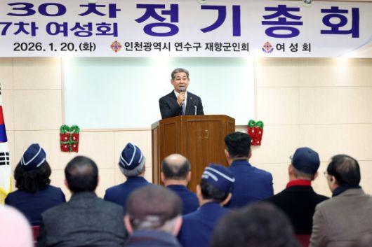 인천광역시의회 정해권 의장은 '2026년 제30차 연수구 재향군인회 및 제27차 연수구 재향군인회 여성회 정기총회'에 참석했다/[사진=인천시][인천=팍스경제TV] 인천광역시의회 정해권 의장은 20일 인천시 연수구 보훈회관에서 열린 '2026년 제30차 연수구 재향군인회 및 제27차 연수구 재향군인회 여성회 정기총회'에 참석해 회원들을 격려했습니다.