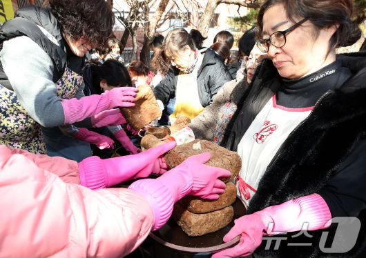 (대구=뉴스1) 공정식 기자 = 20일 대구 달서구 계명문화대에서 열린 '장 담그기 특강'에 참여한 슬로우푸드조리과 성인학습자와 달서구 주민이 전통 방식으로 장을 담그고 있다. 이 특강은 대구 달서구와 계명문화대가 협력해 전통 발효음식 문화 체험 기회를 제공하기 위해 마련됐다. 이날 담근 장은 3개월 숙성한 뒤 장 가르기와 장 뜨기 과정을 거치면 된장과 간장으로 나눠지며, 완성된 장은 어려운 이웃과 나눌 예정이다. 2026.1.20/뉴스1