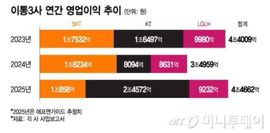 20일 금융정보업체 에프앤가이드에 따르면 지난해 이통3사 합산 매출은 60조9582억원, 영업이익은 4조4662억원으로 추정된다. 전년 대비 각각 3%, 28% 증가한 수치다. 이통3사 합산 영업이익이 4조원을 넘어선 건 2023년 이후 2년 만이다. 지난해 이통3사 모두 해킹으로 몸살을 앓은 것에 비하면 실적은 선방했다는 평가가 나온다.