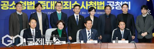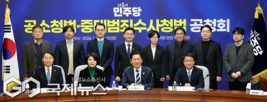 (서울=국제뉴스) 더불어민주당 정청래 대표와 한병도 원내대표, 윤창렬 국무실장 등 참석자들이 20일 서울 여의도 국회에서 열린 공소청법-중대범죄수사청법 공청회에서 기념촬영을 하고 있다./사진=이용우 기자