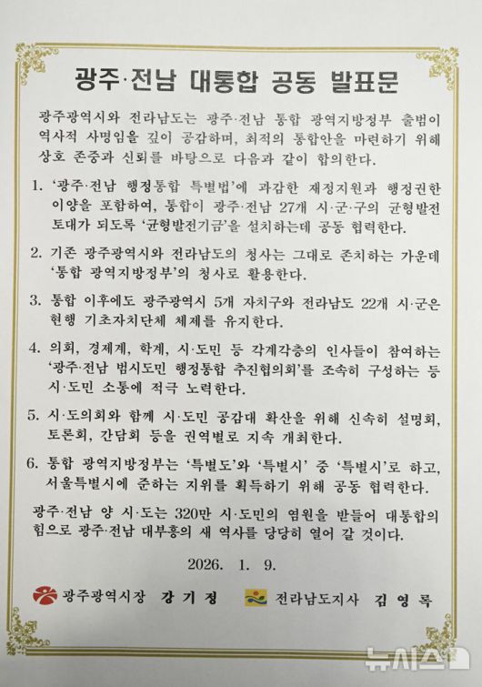 [광주=뉴시스] 이영주 기자 = 강기정 광주시장과 김영록 전남도지사가 9일 광주·전남 행정통합 시도민 보고회를 열어 낭독한 공동 발표문 전문의 모습. 2026.01.09. leeyj2578@newsis.com |
